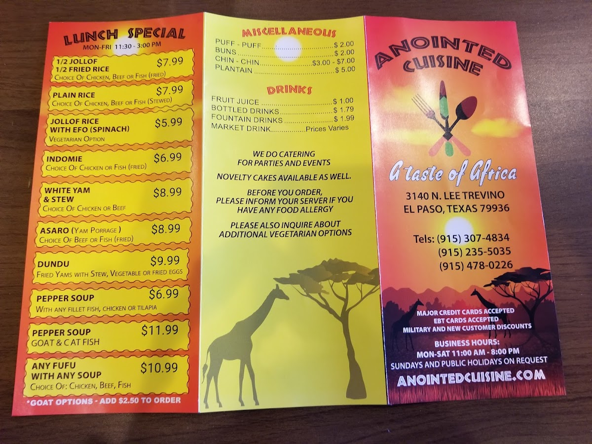 Welcome to Anointed Cuisine: A Taste Of Africa, where the vibrant flavors of African cuisine come to life in El Paso, Texas. Situated at 3140 Lee Trevino Dr, this cozy restaurant offers a culinary journey with a menu featuring unforgettable dishes. Start your adventure with their renowned Akara, delicious blended and fried black-eyed peas, or the savory Meat Pie, a delightful mix of seasoned ground beef, potatoes, and carrots.
